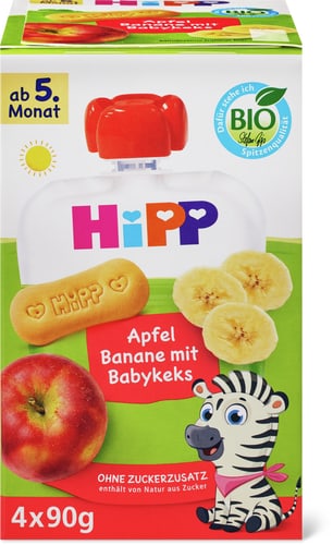 Die HiPP Baby-Quetschbeutel mit Babykeks sind ideal als Zwischenmahlzeit. Mit dem gratis Löffelaufsatz ist das Füttern ganz einfach. Ohne zugesetzten Zucker.